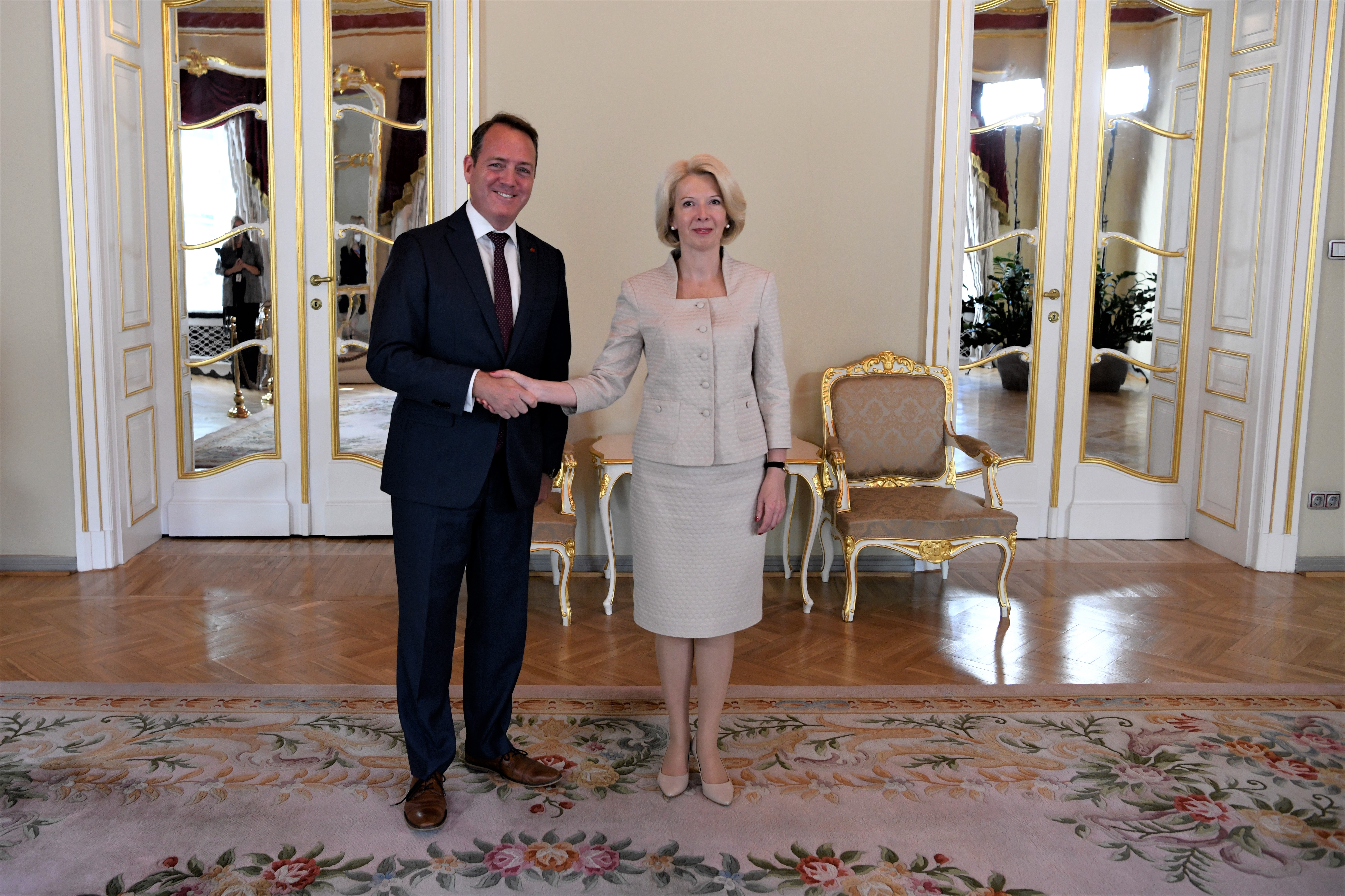 2022.gada 10.augusts. Saeimas priekšsēdētāja Ināra Mūrniece atvadu vizītē tiekas ar Kanādas ārkārtējo un pilnvaroto vēstnieku Latvijā Kevinu Reksu (Kevin Rex). Foto: Juris Vīgulis, Saeima. Izmantošanas noteikumi: saeima.lv/lv/autortiesibas