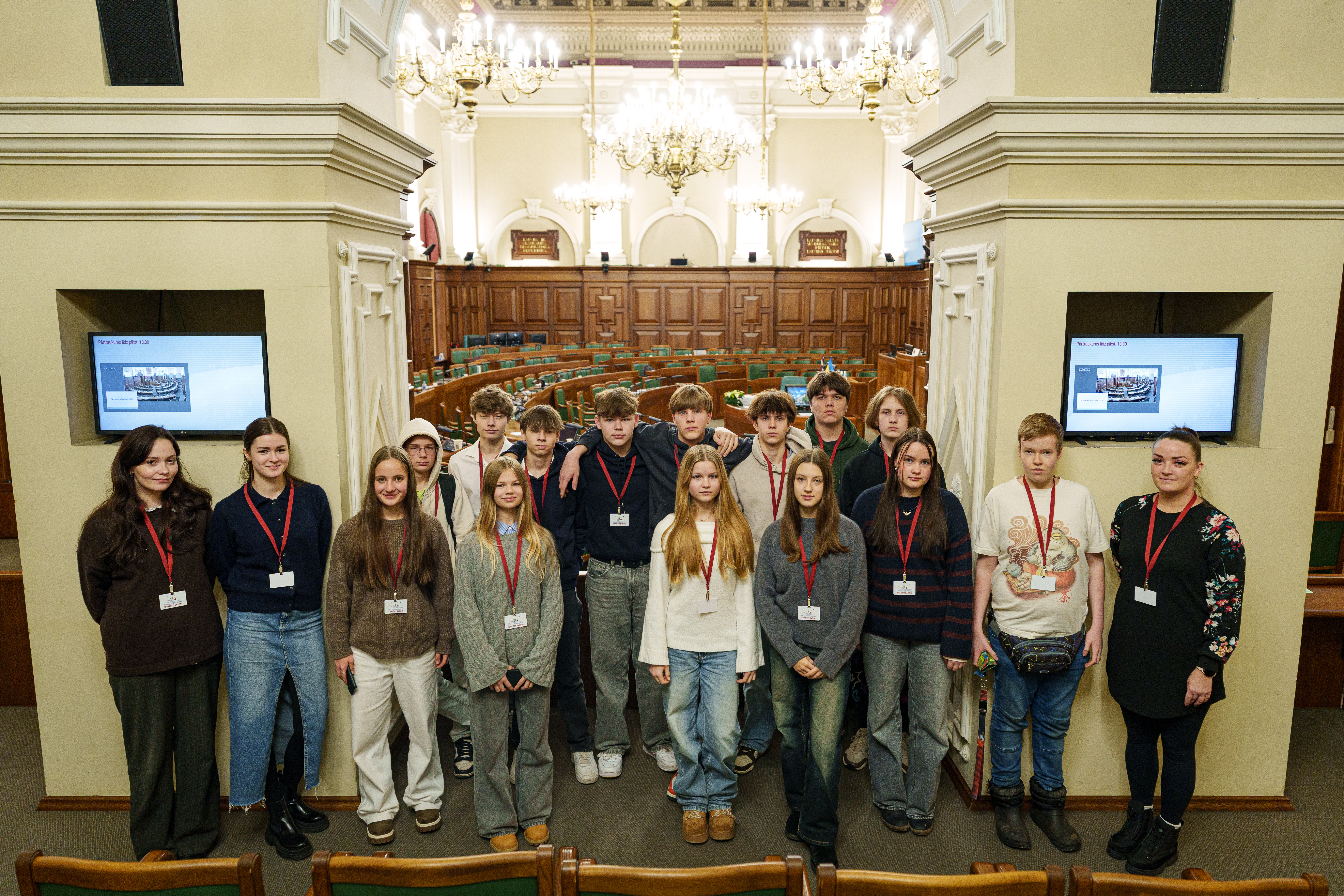 2025.gada 27.novembris. Pamatskola "BŪSIM" 9. klases skolēni apmeklē Saeimu skolu programmas "Iepazīsti Saeimu" ietvaros. Foto: Reinis Inkēns, Saeima Izmantošanas noteikumi: saeima.lv/lv/autortiesibas