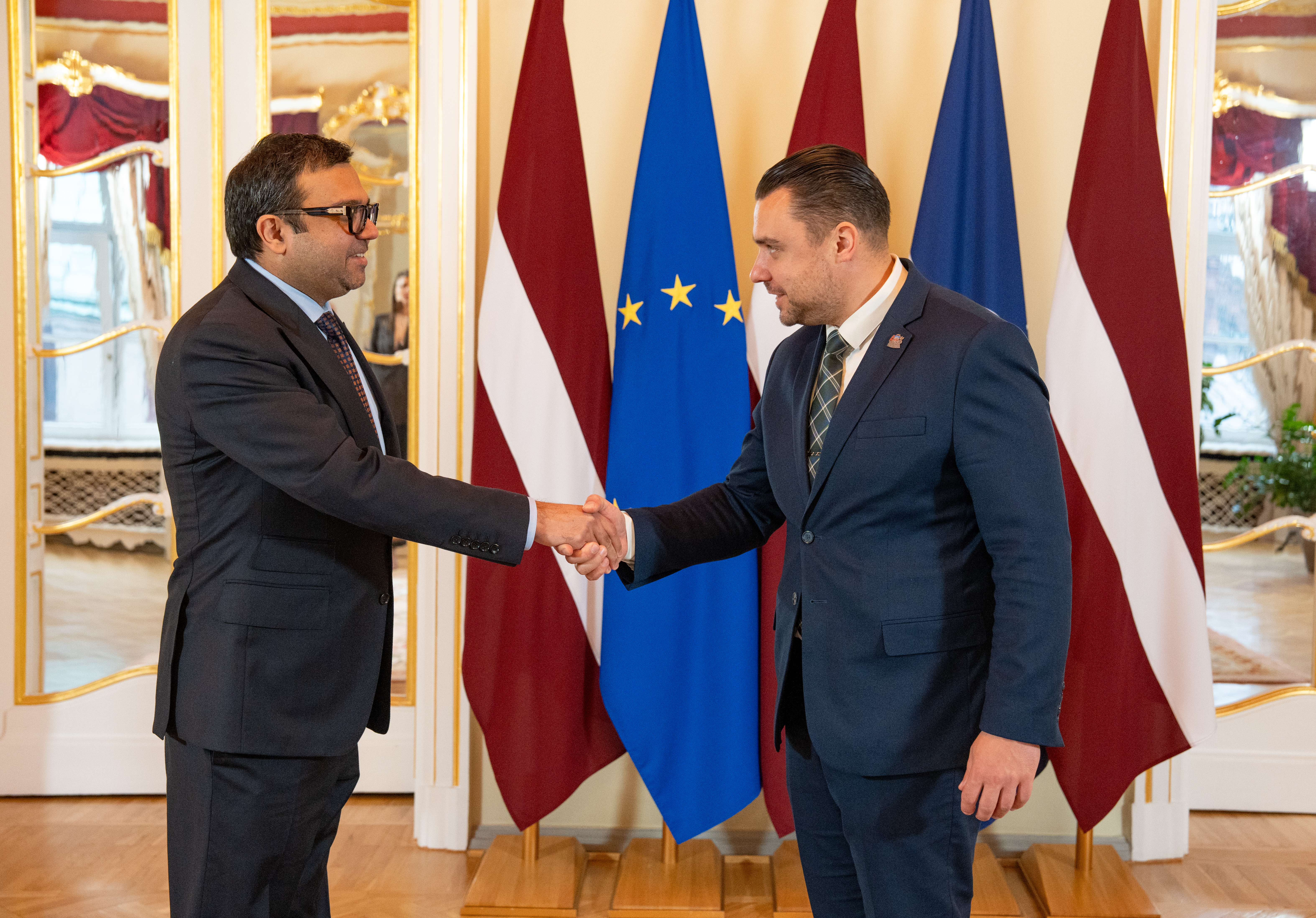 2025. gada 31. oktobris. Saeimas sekretāra biedrs Jānis Grasbergs tiekas ar Pakistānas Islāma Republikas ārkārtējo un pilnvaroto vēstnieku Latvijas Republikā Muhammadu Samiurrehmānu (Muhammad Sami-ur-Rehman). Foto: Ieva Ābele, Saeima Izmantošanas noteikumi: saeima.lv/lv/autortiesibas